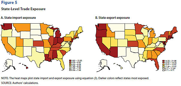 Second, the U.S. industries that export more intermediate goods to the world (and are thus “exposed” to potential retaliation by foreign governments) are (i) Other transport equipment; (ii) Computer, electronic, and optical; (iii) Machinery and equipment; (iv) Electrical equipment; and (v) Chemicals and pharmaceuticals. The states specializing in these products (and are thus “exposed” too) are (i) Washington; (ii) Connecticut; (iii) Massachusetts; (iv) Arizona; (v) Rhode Island; (vi) Oregon; and (vii) California. Arizona’s exposure, the authors note, comes from specializing in computers and electronics, as well “other transport equipment.”