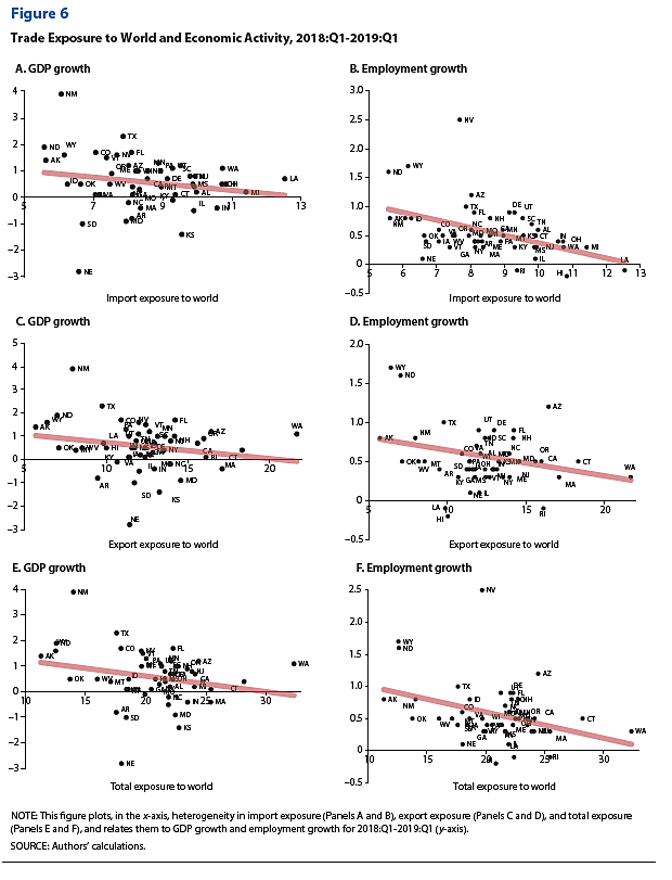 (i) There is a negative and significant correlation between the initial exposure to trade and economic activity; (ii) the negative correlation is stronger with employment growth than it is with output growth; and (iii) the negative correlation is stronger with import exposure than it is with export exposure. That is, those states more exposed to trade experienced lower increases or even decreases in output growth and employment growth between 2018 and 2019. These findings reflect that firms operating in states very exposed to trade adjusted their employment and production decisions after announcements of tariff increases. The adjustments were stronger in terms of employment than in terms of output, and they were stronger in states very exposed to U.S. tariffs than in states very exposed to retaliatory tariffs.